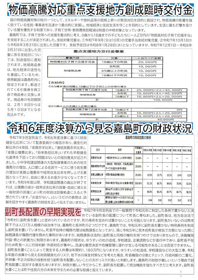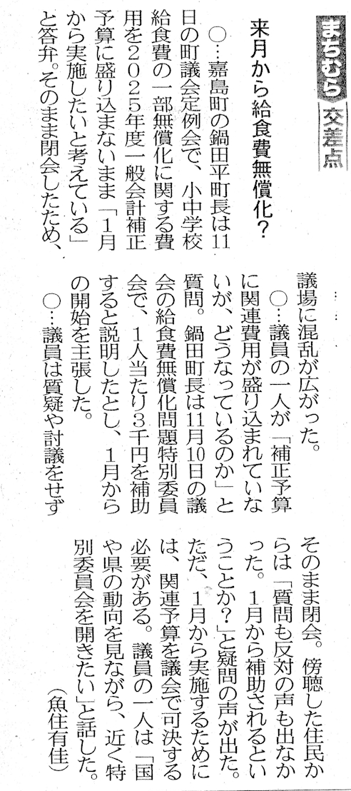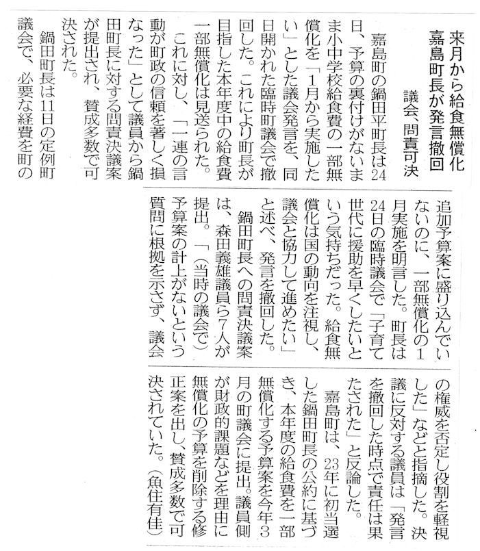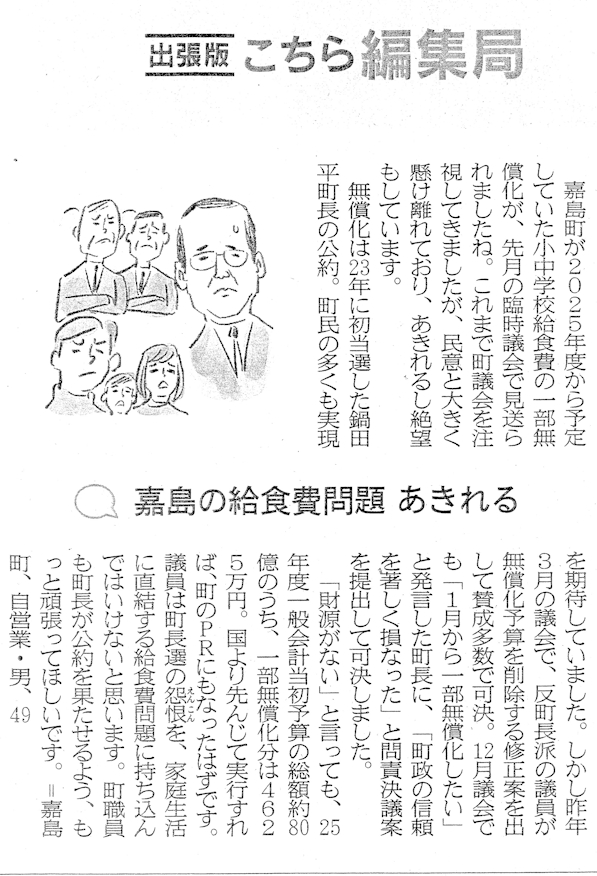 1月23日の熊本日日新聞に嘉島町議会の動きを批判する町民の方からの投稿記事が掲載されました。議員の一人として多数決の論理で押し切られることに対し相手を説得できなかったことについて何か方策はなかったのかと悔しい思いです。問責決議案の内容について事前にわかっていれば、問責理由書のおかしな個所に強く反論できたのですが、何の前触れもなくいきなり提出されたものですから、議場で効果的な反論ができなかったことを深く反省しています。嘉島町の方のfacebookにも「本当にくだらん!」と議会を批判する投稿がありました。町長は令和8年度から中学校の学校給食費の完全無償化方針を議会に伝えられましたが、簡単ではないと思っていますが頑張ります!
