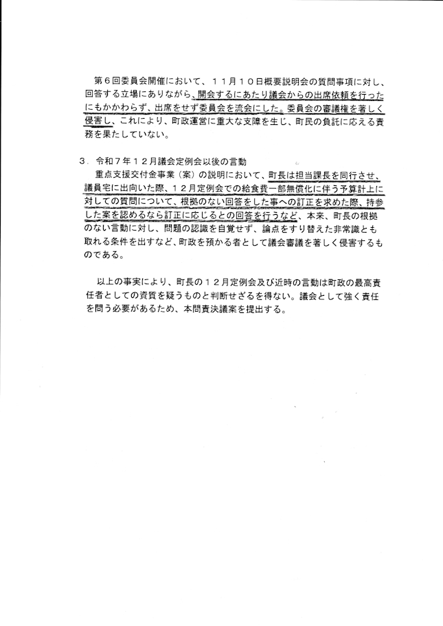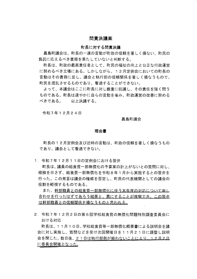 11月10日に開催された鍋田町長が給食費無償化特別委員会で3学期から給食費一部無償化を実施すると説明があったにも拘らず、12月定例会の補正予算案に計上されていなかったため、私が給食費一部無償化実施の可否について質疑しました。鍋田町長は1月から実施すると答弁しましたが、地方自治法208条の規定に抵触する答弁でした。地方自治法208条は、予算のない歳出を禁じているもので、発言を禁じているものではないのですが、予算の裏付けのない事業を実施するかのような誤認を与えるため不適切な発言になります。208条法律違反ではないので発言の撤回で処理できます。12月24日の臨時議会で鍋田町長は、12月定例会での答弁を撤回しましたが、この不適切だった発言に不満な7名に議員から鍋田町長に対する問責決議案が提出されました。その理由書には3つのことが書かれていました。1は、町執行部内からの情報漏洩匂わせるもので町長の答弁が幹部職員との信頼関係を損なうと指摘するものです。ただ、「推測」とか「思われる」とか「はずであろう」という表現は客観的事実認定を放棄しているに等しいものですし、事実であれば公務員の守秘義務違反も問われる事案です。2は、特別委員会の制度理解が根本から間違っていると言えます。特別委員会に「執行部職員の出席義務」も「行政を拘束する審議権」も存在しません。委員会の役割は調査であり、行政運営を拘束したり、予算編成を左右する権限はありません。3では、議長宅でのやり取りが記載されています。議長が問責理由形成に関与している疑いが極めて濃厚です。議長の中立義務違反の疑いがあります。以上の考察からこの理由書は問責の合理的根拠にはなりません。議員発議の案件は、賛同者がいれば自由に提出できるので今回の件も手続き上の瑕疵はないのですが、問責や不信任等の政治的議案は全員協議会での事前説明が必要だと感じています。今回の問責決議案は私を含める3名は蚊帳の外に置かれていました。3月の定例会で給食費一部無償化予算案を議員動議で否決した時と全く同じやり方でした。議会運営としては,極めて不健全・不公平・民主主義に反すると強く思います。なお、問責決議全文は嘉島町ホームページで閲覧することができます。