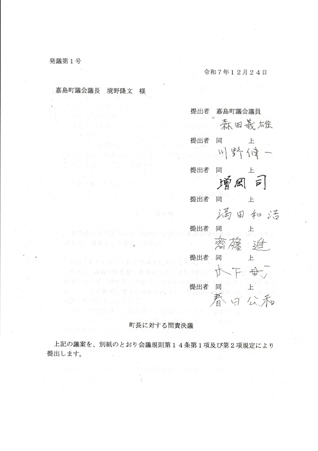12月24日の臨時議会で、鍋田町長問責決議案が可決されました。
