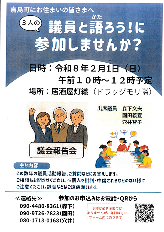 今年の3月定例会での給食費一部無償化予算案否決から12月24日の臨時議会での鍋田町長問責決議案採決までの一連の流れの報告を含む議員活動報告会と皆様の声を聴く会を開催します。町所有の公民館は政治的活動には使用できませんので、ドラモリ横の居酒屋「灯織」を昼間お借りする予定です。決定しましたら再度お知らせいたします。