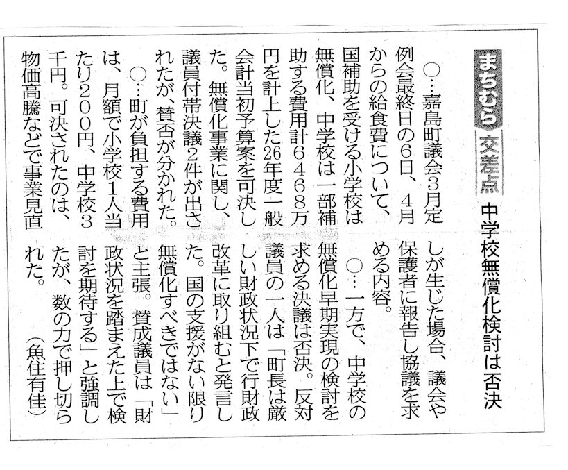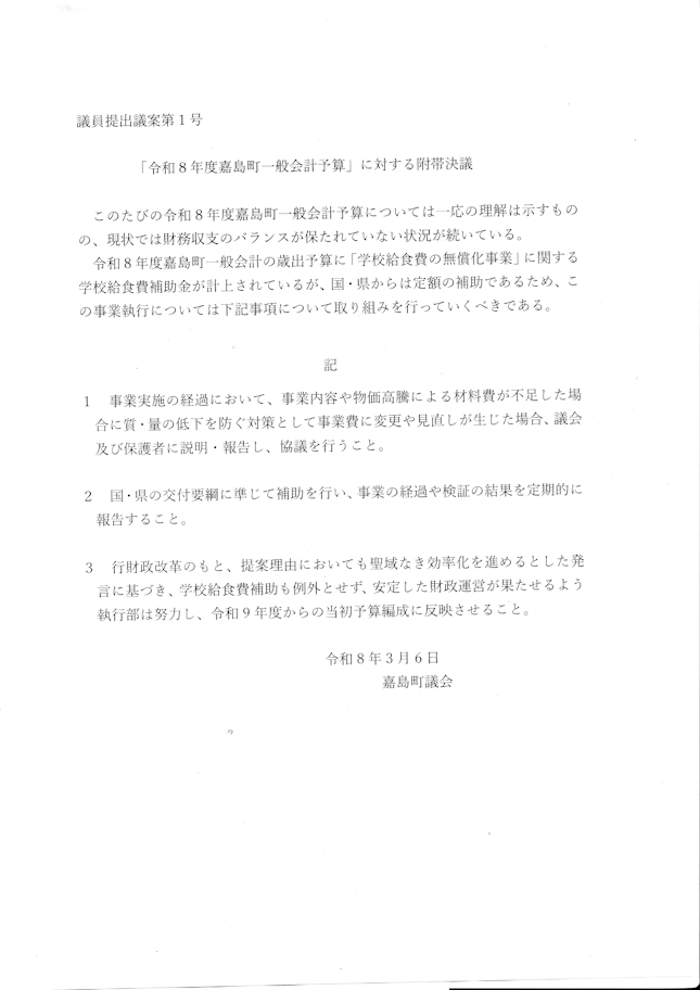 令和8年度一般会計予算に小学校の学校給食費の無償化と中学校の学校給食費については月額3,000円補助する原案が可決されました。この件について2件の付帯決議案が提出されました。一つは、小学校の学校給食費は、国・県からの補助事業であるため学校給食費も含めた安定した財政運営を努力することを求めたもの、もう1件は、私が発議した国がまだ決めていない中学校の学校給食無償化の実現に向けて持続可能な財源確保を具現化し、無償化実現に向けた取組を求めたものです。一つ目の財政面の問題については当然クリアすべきことですので財政基盤の確立を求めた議員提出議案第1号は、反対者なく可決されました。しかしながら中学校給食費無償化実現の努力を求めた議員提出議案第2号は、反対多数で否決されました。昨年6月に給食費無償化を求める請願に対して議会は「趣旨採択」の判断をしました。早期実現は難しいが給食無償化に反対ではないという意思表示です。また、令和7年度一般会計予算に計上されていた給食費一部無償化予算を否決した議員で無償化反対といった声を聞いたことはありません。全議員で編成された給食費無償化問題特別委員会でも無償化反対の議論はありませんでした。なのに何故?という思いです。でも、議会という記録に残る公の場本音が聞けたことは大きな前進でした。嘉島町の給食費を巡る議会のあり方を何度も取り上げてきた熊本日日新聞社も3月7日の記事で「数の力で押し切られた」と強烈な皮肉を述べていました。