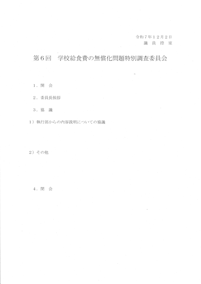 第6回給食費無償化問題特別委員会が開催されました。